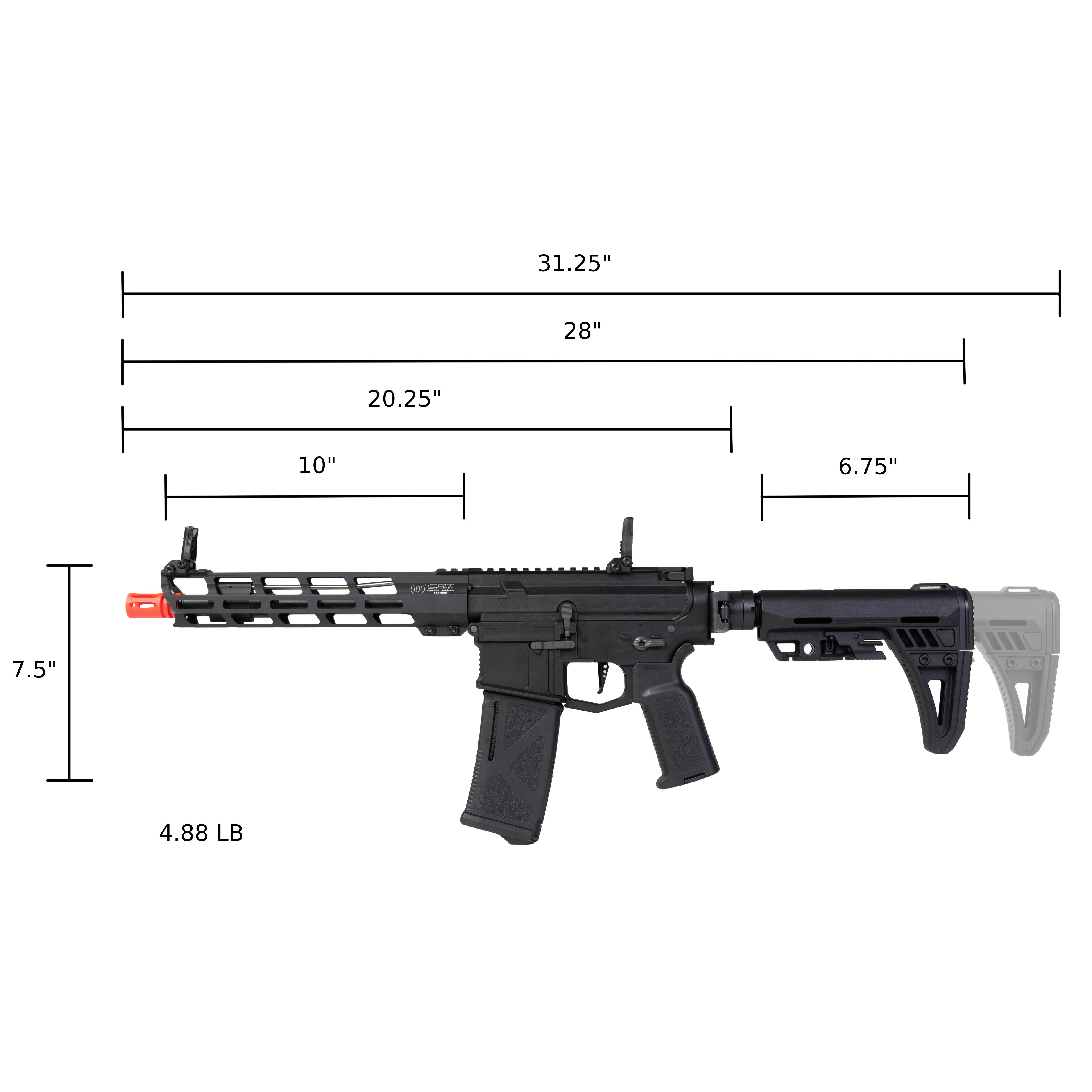 ARCTURUS X C.A.T. AR-15 Versatile 10" AR AEG contains a aluminum hanguard, polymer charging handle, and adjustable 1913 PICATINNY FOLDABLE MODULAR STOCK. The handguard features a M-LOK rail with picatinny mounting system for easy mounting of accessories. The AEG has a ultra-compact size in-line DEANS 11.1v LIPO READY MOSFET with a 24k High Performance Motor w/ MIM Steel Pinion Gear for quick trigger response. Containing a split style gearbox for easy access and tunning. The gearbox comes with a mechanical PRE-COCKING sector gear for adjustments. Installed with a swappable mag well that allows you to change to M4, AK, or PCC magazine.